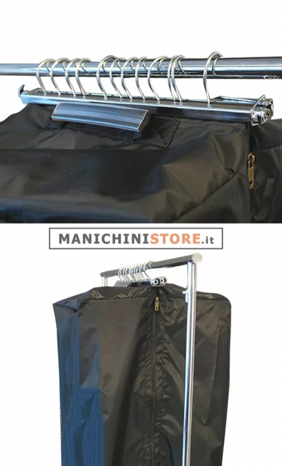 Grazie alla barra metallica che fissa gli appendiabiti, la sacca è ideale per il trasporto di campionario permettendo l'ottimale e ordinata presentazione di ogni singolo capo.