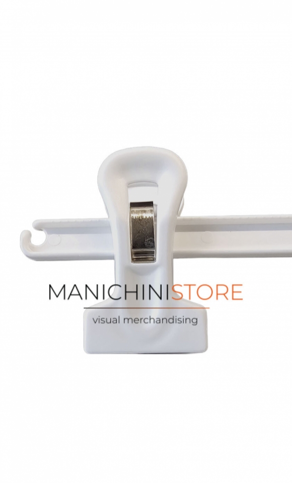 Gruccia appendiabito con pinze realizzata in plastica bianca.