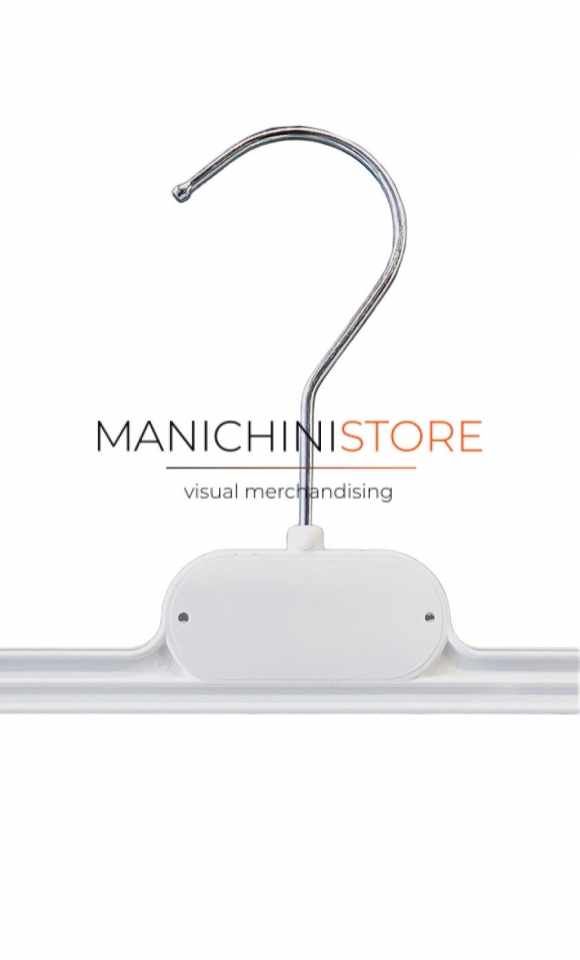 Gruccia appendiabito con pinze realizzata in plastica bianca.