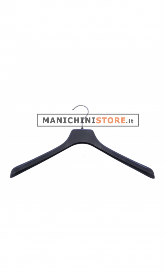 Economica e funzionale gruccia capospalla di fabbricazione Made in Italy realizzata in plastica nera con pratico antiscivolo adesivo sulle spalle.