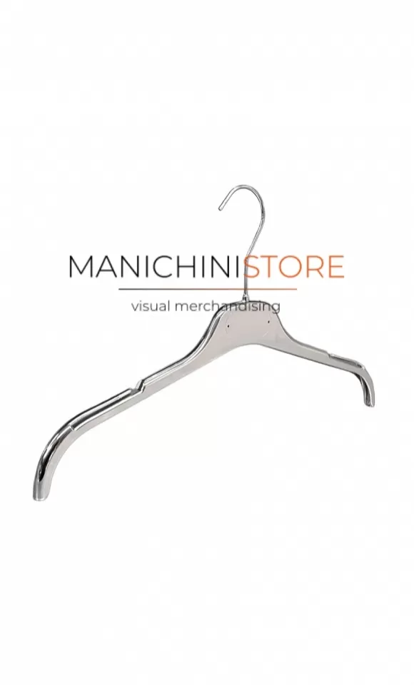 Versatile gruccia capospalla con alette, di fabbricazione Made in Italy realizzata in plastica verniciata color argento effetto cromato.
