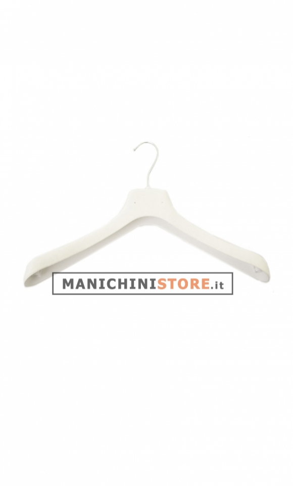 Pratica ed economica gruccia capospalla di fabbricazione Made in Italy realizzata in plastica bianca e successivamente vellutata in bianco.