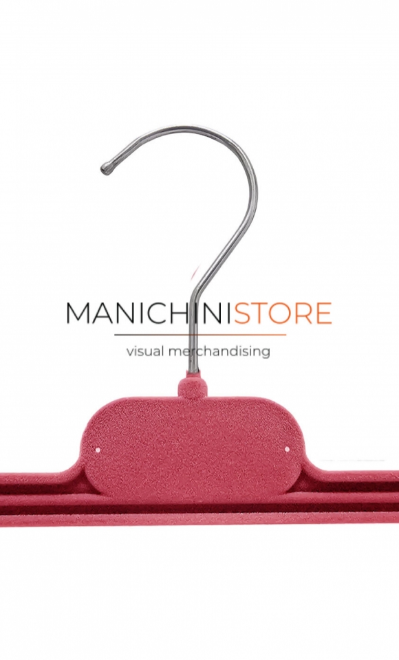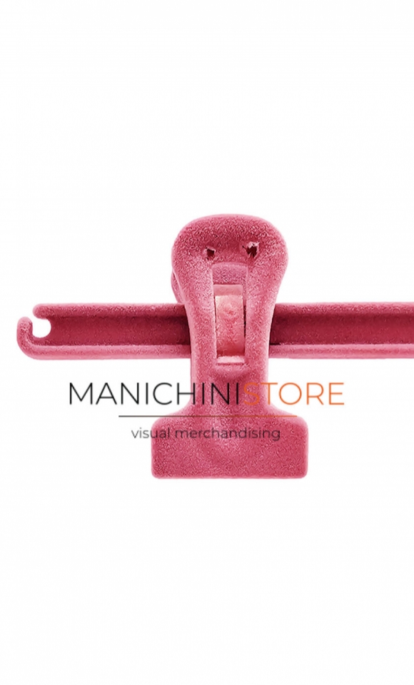 Pratica ed economica gruccia pinza di fabbricazione Made in Italy realizzata in plastica trasparente e successivamente vellutata in colore fucsia.