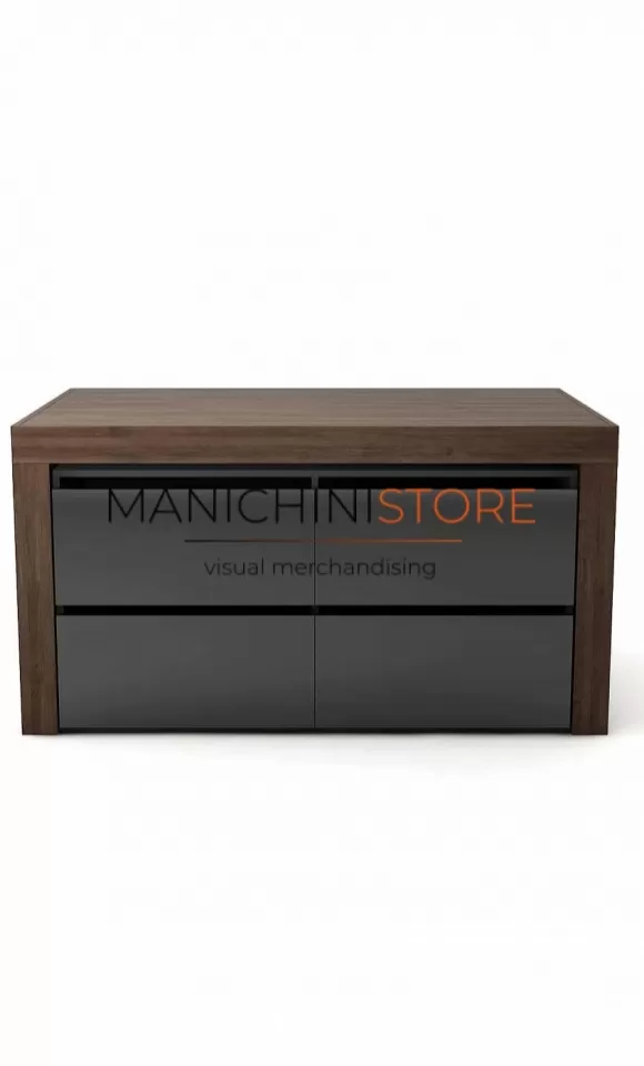 Tavolo espositivo in nobilitato noce bruno con otto cassetti (4 per lato) montati su guide soft closing con frontale in nobilitato nero lucido.