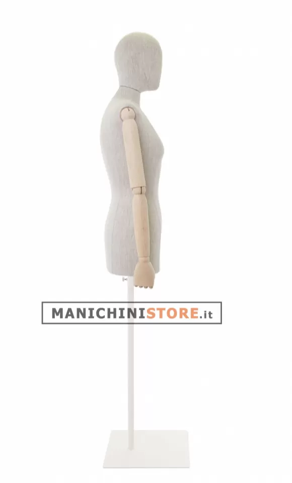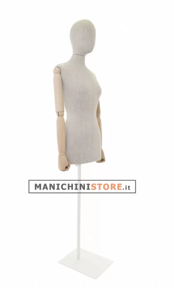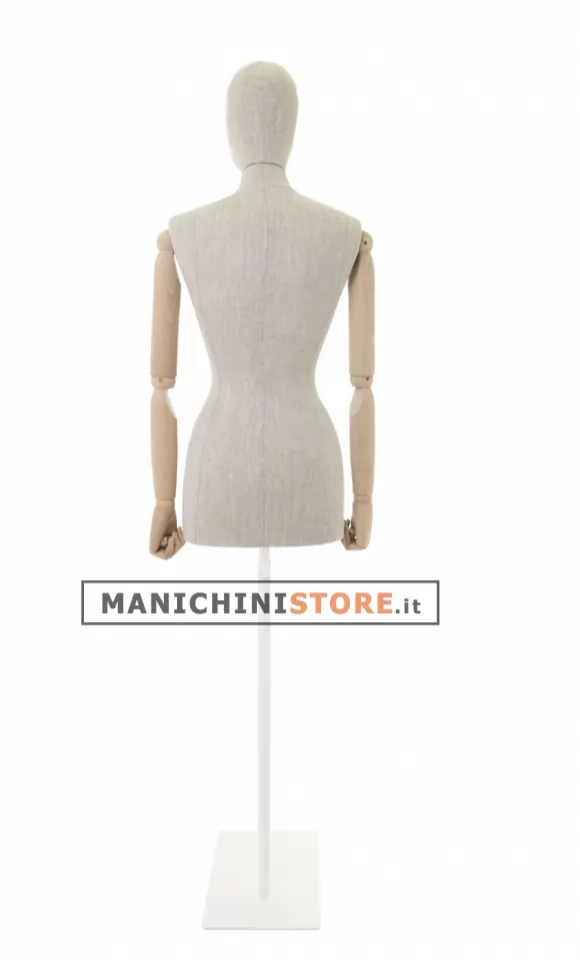 Bellissimo busto donna taglia 42 di produzione Made in Italy, realizzato in poliuretano espanso rivestito in puro lino naturale e accessoriato di braccia in legno. E' completo inoltre di testa rivestita dello stesso tessuto.