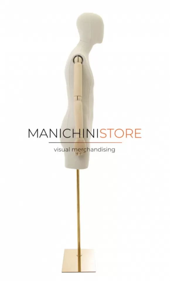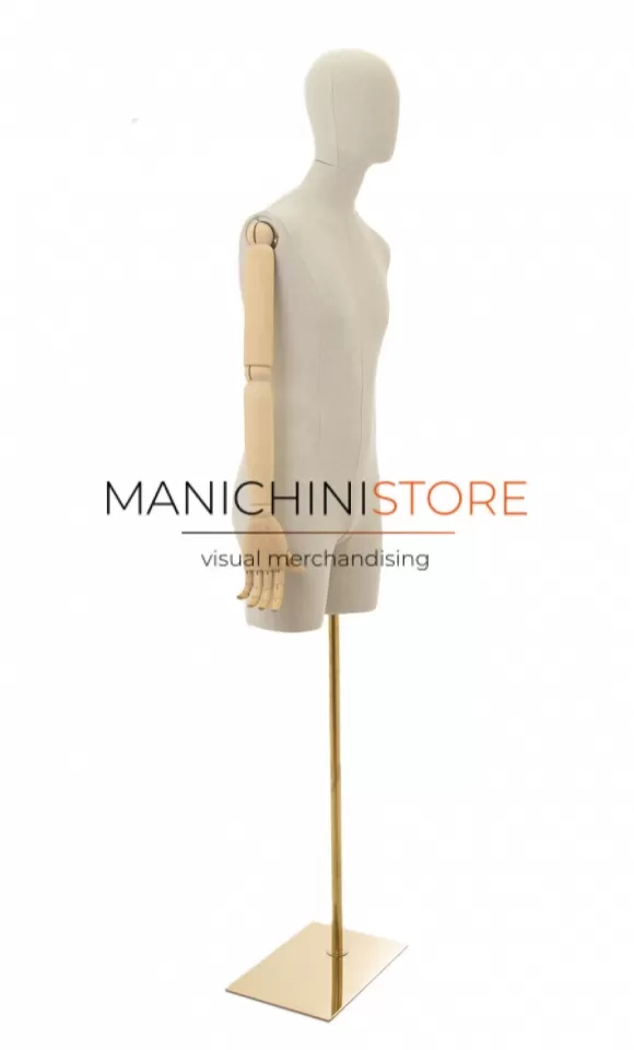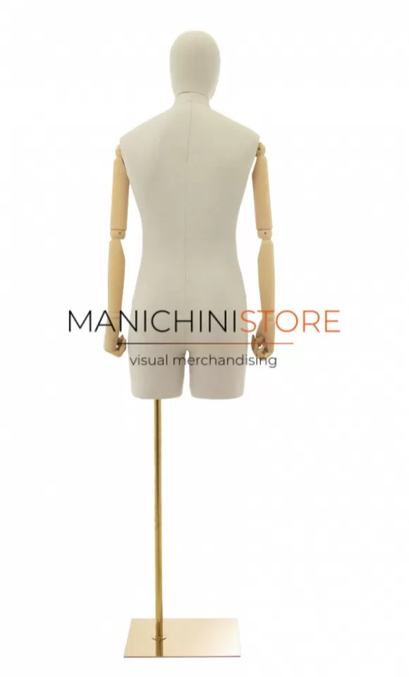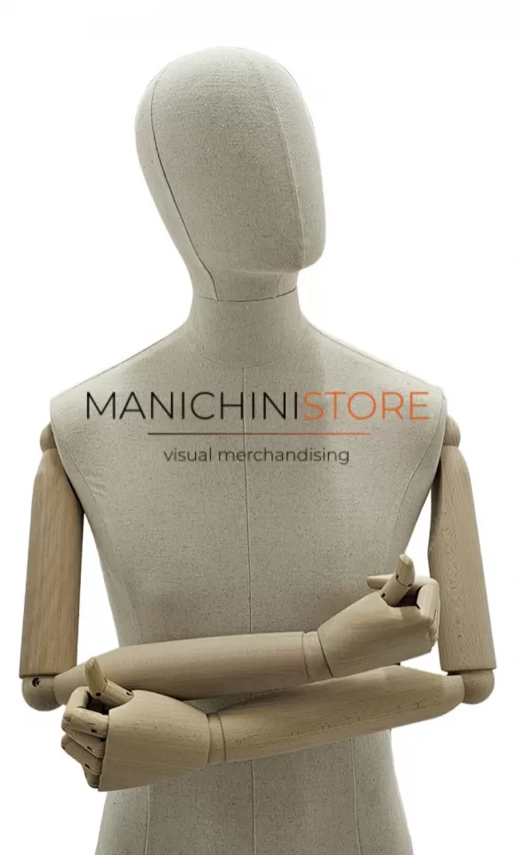 Bellissimo busto uomo con mezza gamba realizzato in vetroresina rivestita in lino naturale e accessoriato di braccia in legno e completo di testa rivestita dello stesso tessuto.