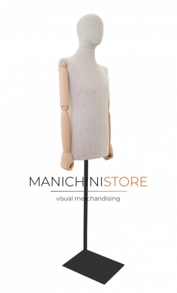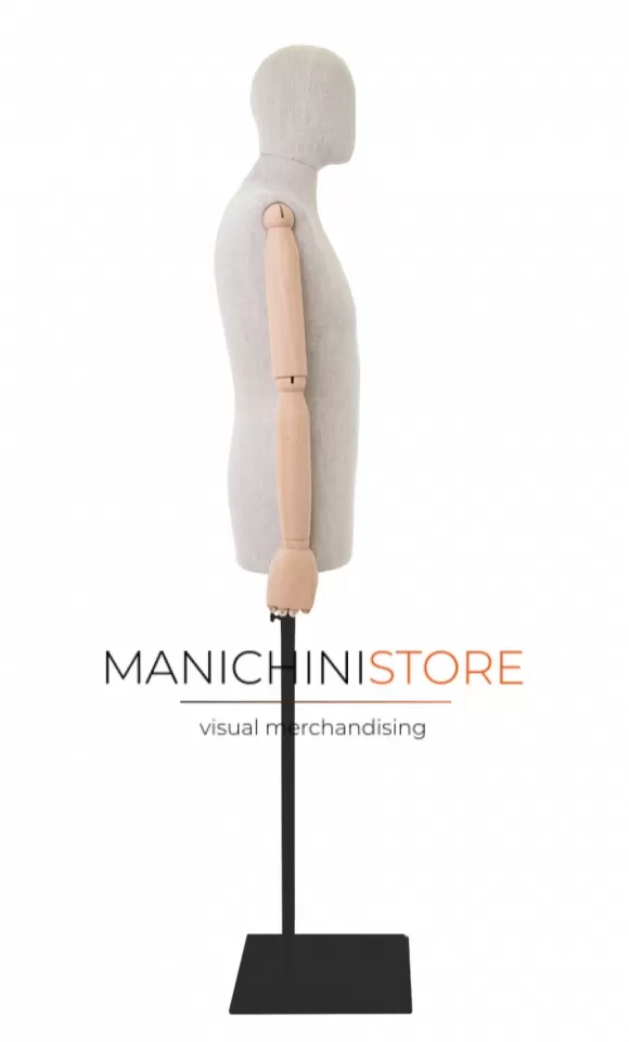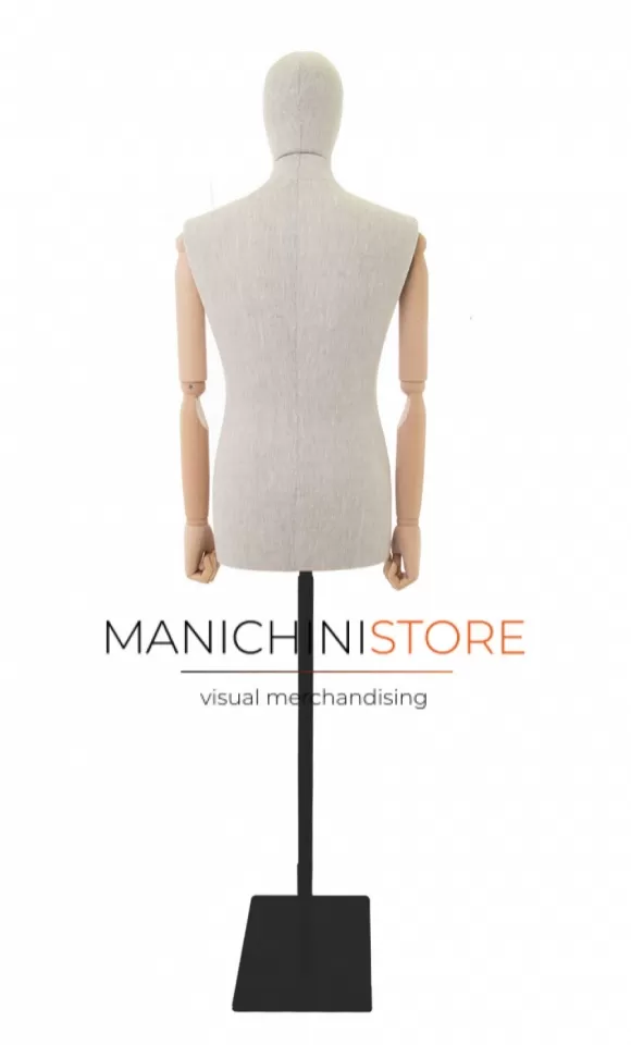 Bellissimo busto uomo taglia 48 di produzione Made in Italy, realizzato in poliuretano espanso rivestito in puro lino naturale e accessoriato di braccia in legno. E' completo inoltre di testa rivestita dello stesso tessuto.