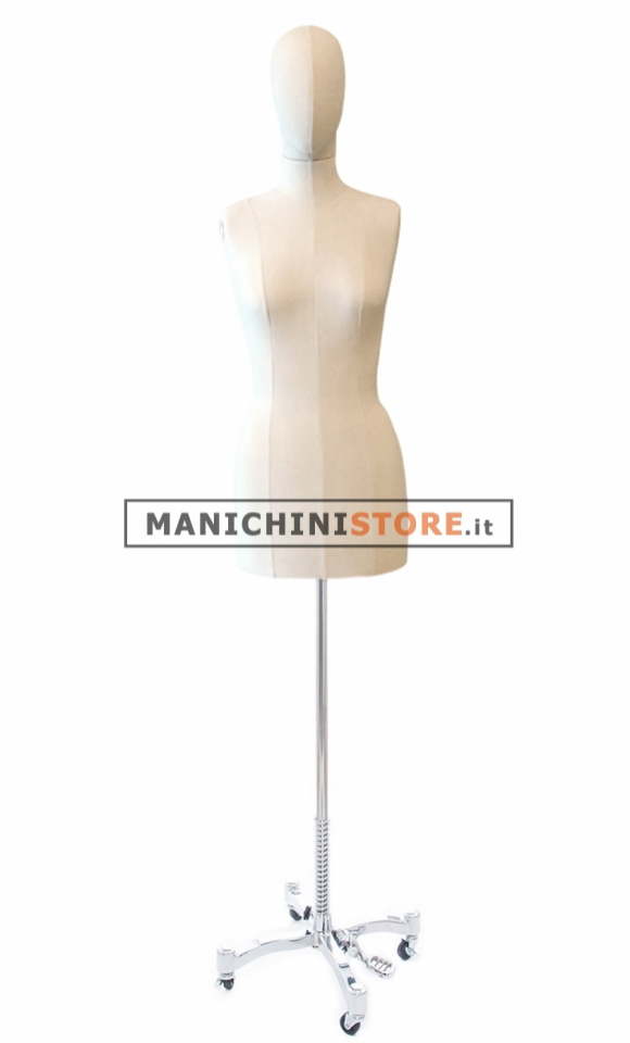 Pensato per dare una nota squisitamente retrò e di classe alle vostre vetrine, il busto sartoriale donna è dotato di una comodissima e pratica base in acciaio cromato con ruote e piantana regolabile in altezza da 136 a 190 cm