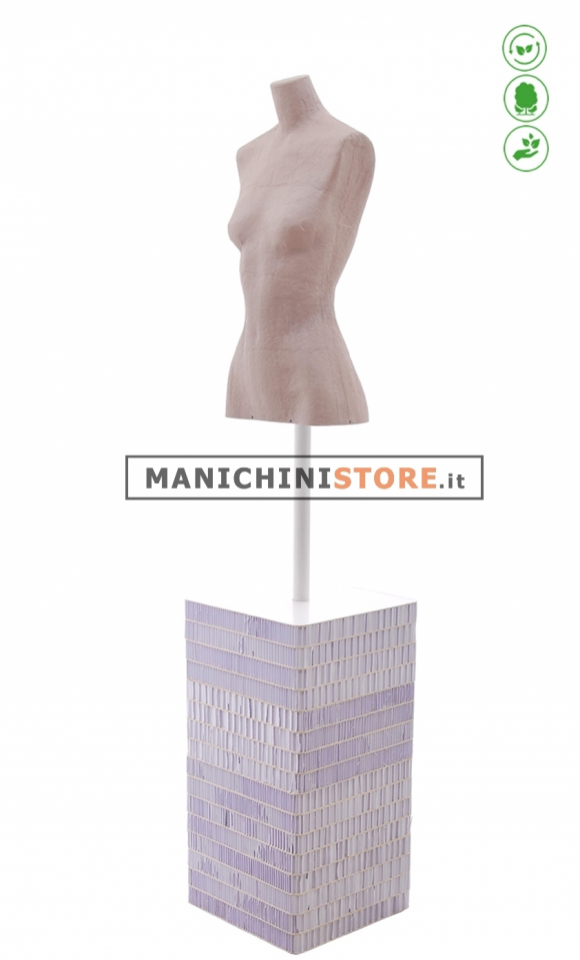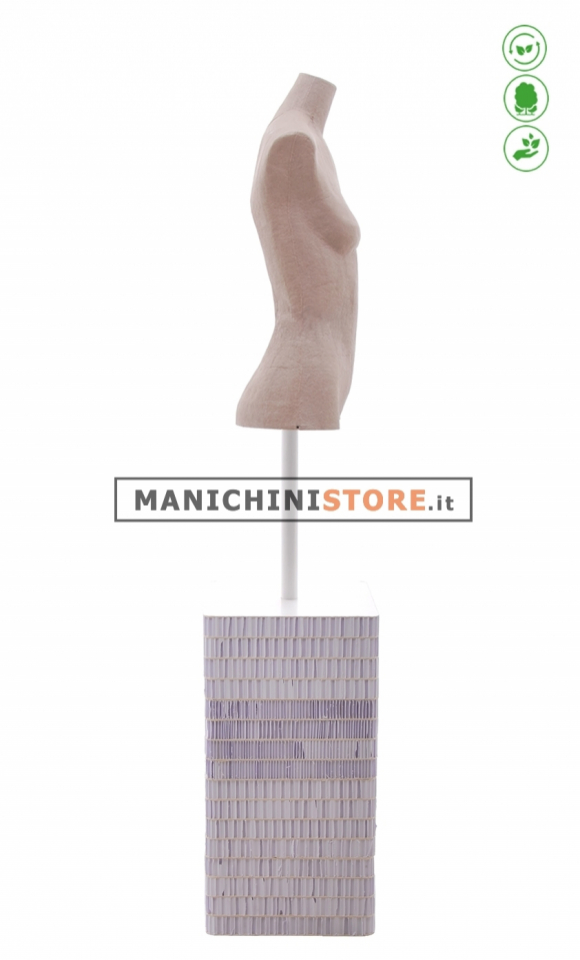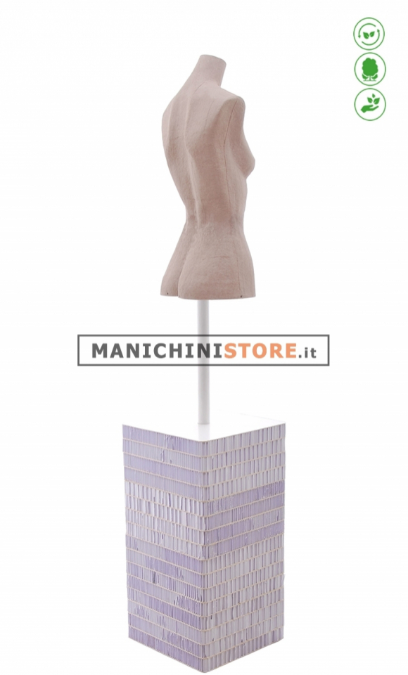 Manichini Store rende disponibile il busto teenager color bianco con base quadrupla quadrata bianca. Il prodotto qui proposto è realizzato con l’utilizzo della cartapesta, la quale viene riciclata, ed è fornito di un innovativo elemento d’appoggio in cartone naturale.