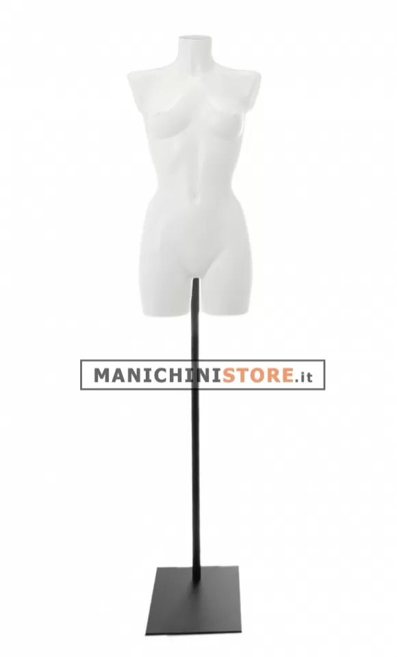 Busto torso donna di fabbricazione Made in Italy realizzato in soffiaggio plastico precolorato bianco, particolarmente robusto e resistente agli urti, dotato di una splendida base con attaco al collo.