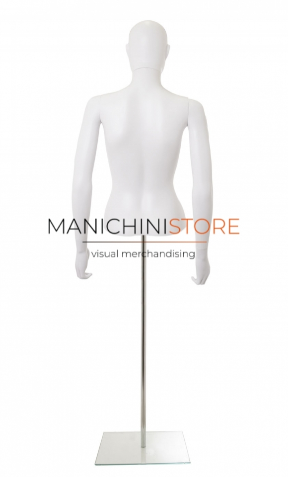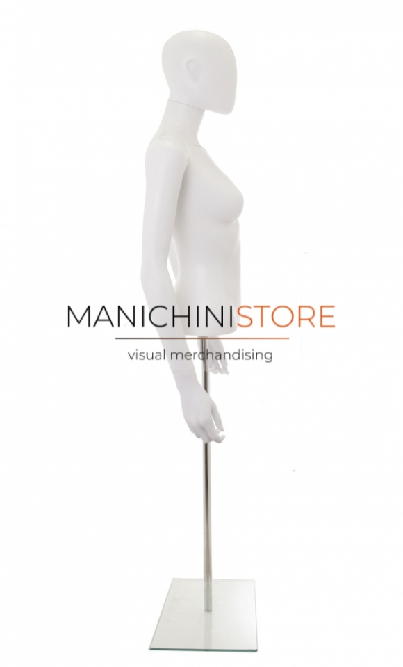 Bellissimo busto torso donna da banco completo di braccia, realizzato in soffiaggio plastico precolorato bianco opaco.