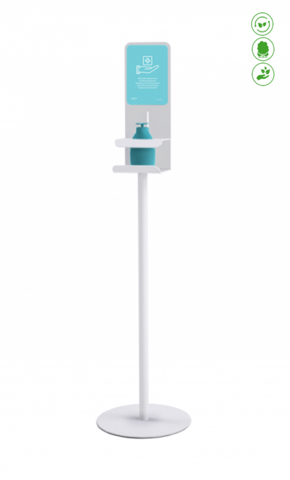 Colonna in acciaio verniciato bianco porta flaconi di gel igienizzante (sapone liquido non incluso).