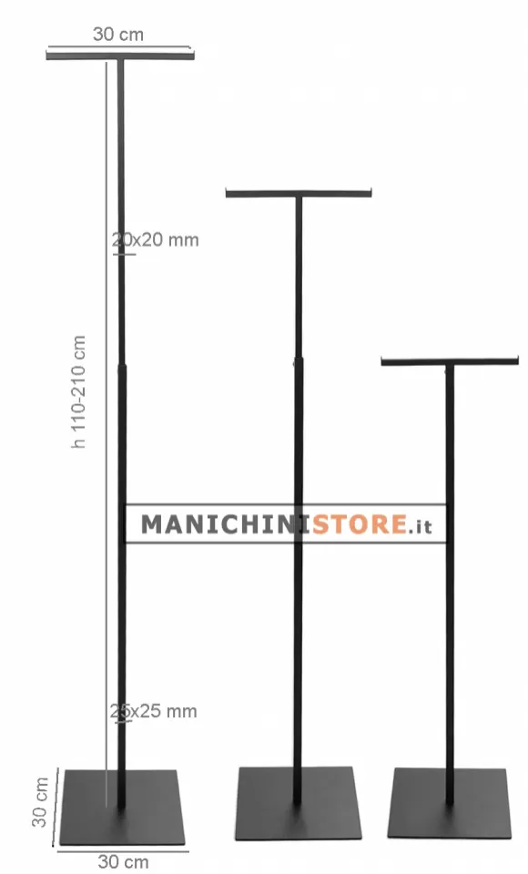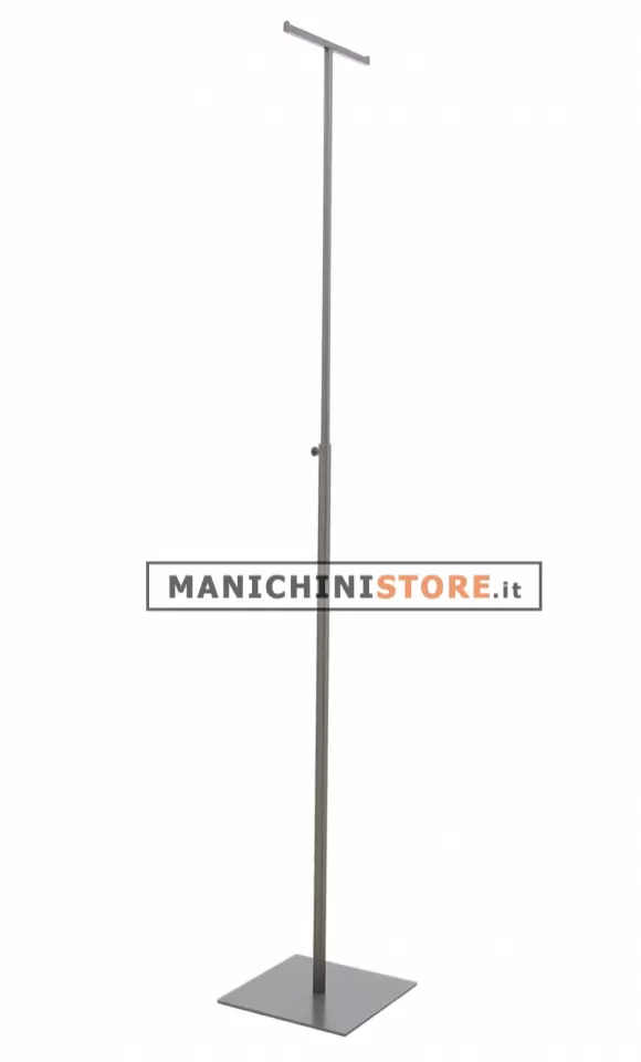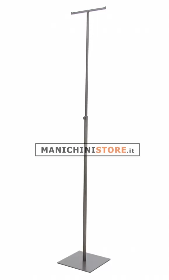 Raffinato espositore porta abiti doppio di fabbricazione Made in Italy realizzato in metallo verniciato in color alluminio opaco regolabile in altezza da 110 a 210 cm. L'espositore saprà esporre con eleganza i vostri capi di abbigliamento e accessori come borse, collane, sciarpe e altri articoli che necessitano di un supporto.