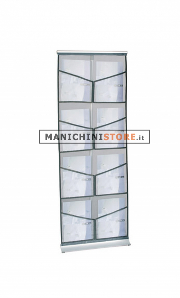 L'espositore è formato da due profili in alluminio e da tasche in tessuto trasparente.