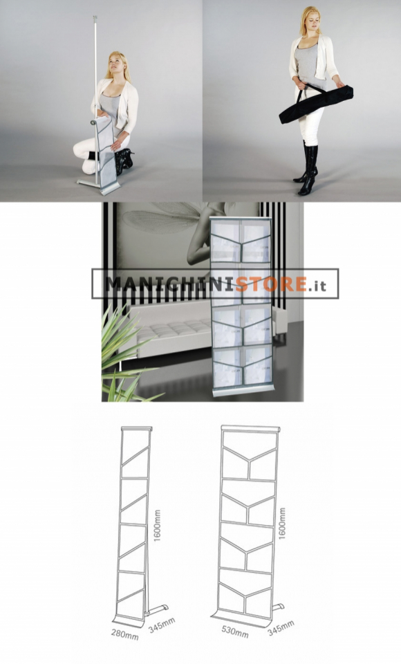 L'espositore a 4 tasche ha un'altezza di 1600 mm, una lunghezza di 280 mm e una profondità di 345 mm.