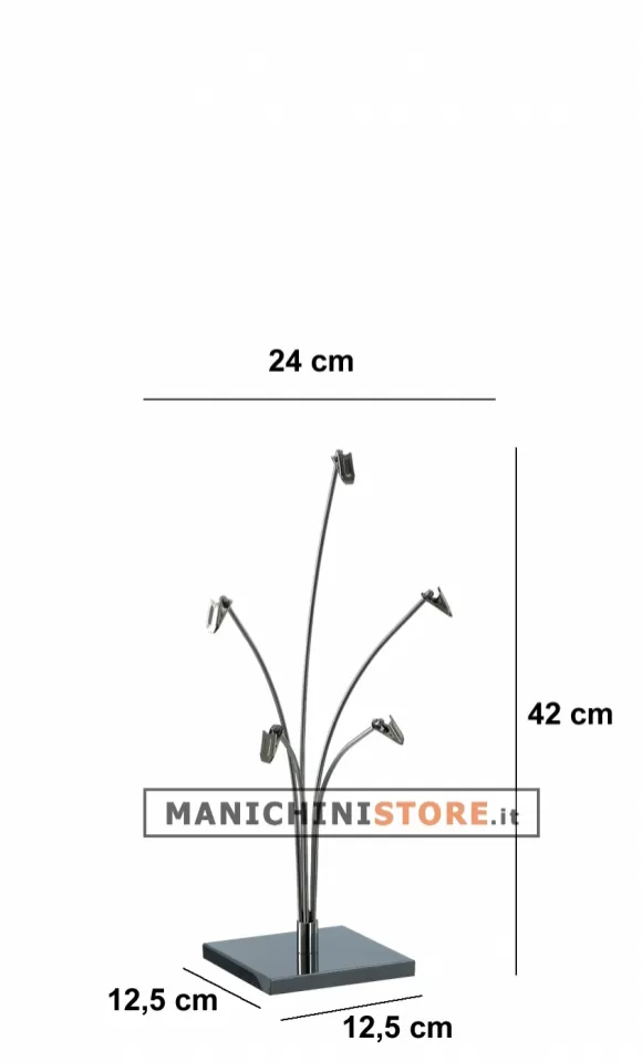 Funzionale espositore porta accessori di fabbricazione Made in Italy realizzato in acciaio cromato e dotato di 5 pinze con protezione in gomma.