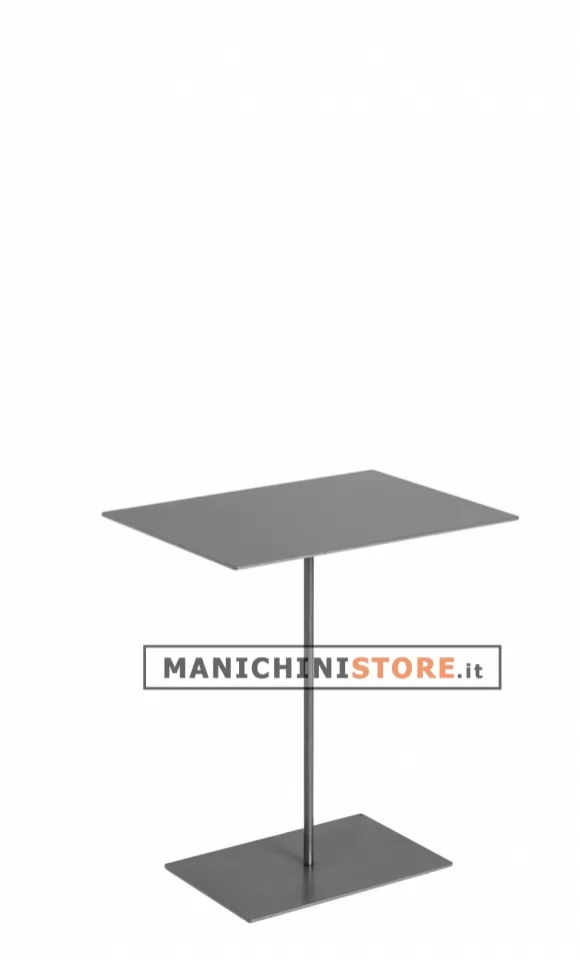 Tavolino espositore dallo stile minimal realizzato in metallo verniciato in color alluminio opaco e di fabbricazione Made in Italy.