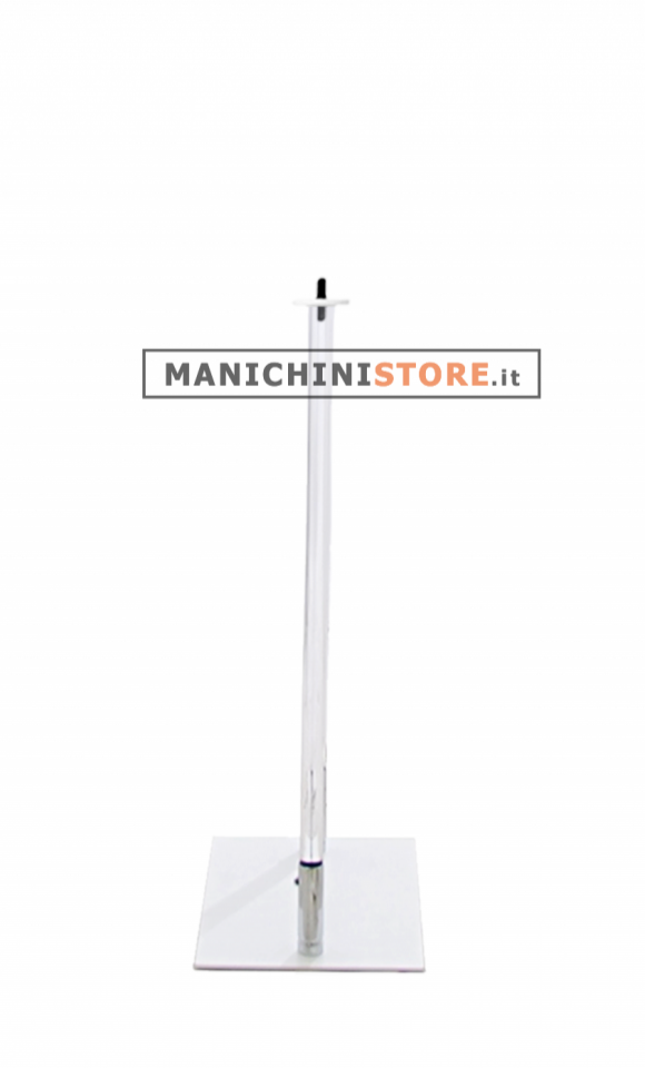 Base rettangolare bianca di fabbricazione Made in Italy 24,5 x 34,5 cm, con aste in plexiglas trasparente di 70 cm. Le aste, dopo averle avvitate singolarmente al busto, vengono inserite agevolmente alla base.