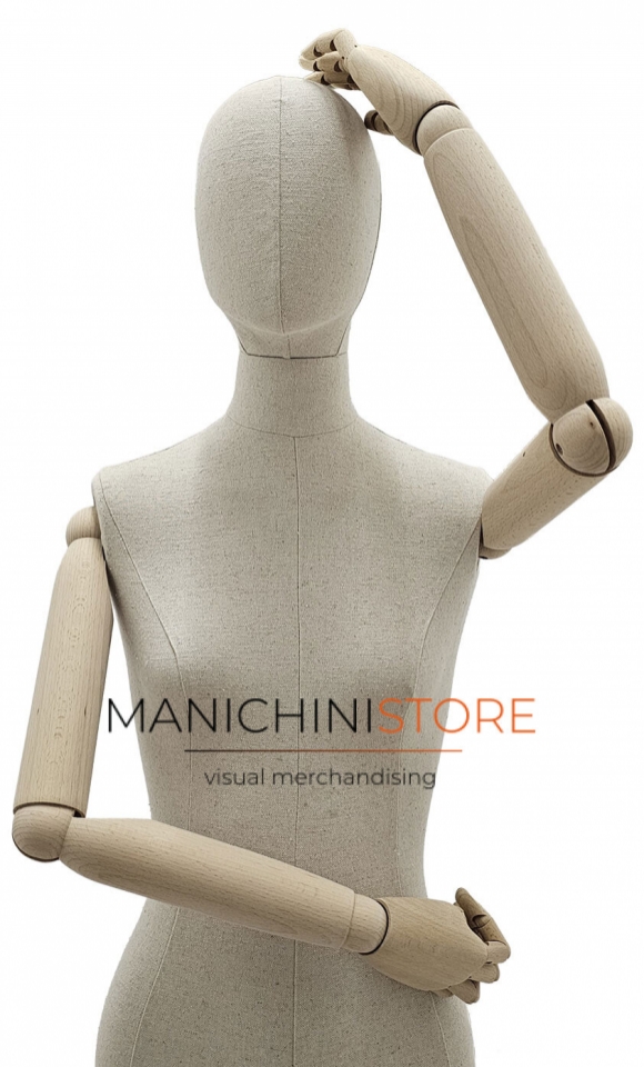 Bellissimo manichino donna della collezione Linen, con busto in vetroresina rivestito in lino e gambe realizzate in vetroresina verniciata in color bianco sporco.