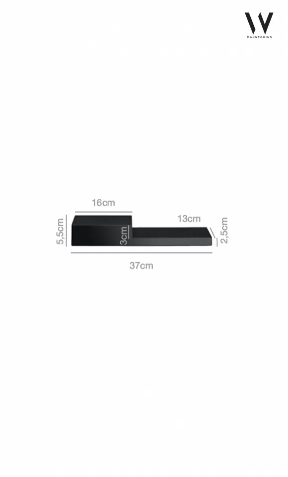 L'espositore misura: Lunghezza complessiva 37 cm, Altezza lato più alto 5,5 cm, Altezza lato basso 2,5 cm, Lunghezza base d'appoggio più alta 16 cm, Lunghezza base d'appoggio più bassa 13 cm, Altezza scalino tra base alta e base bassa 3 cm.