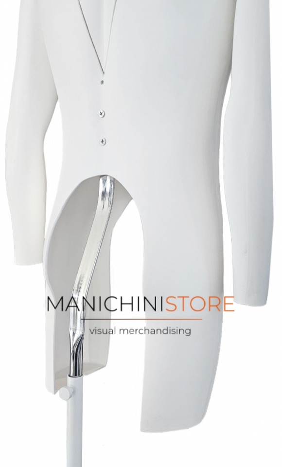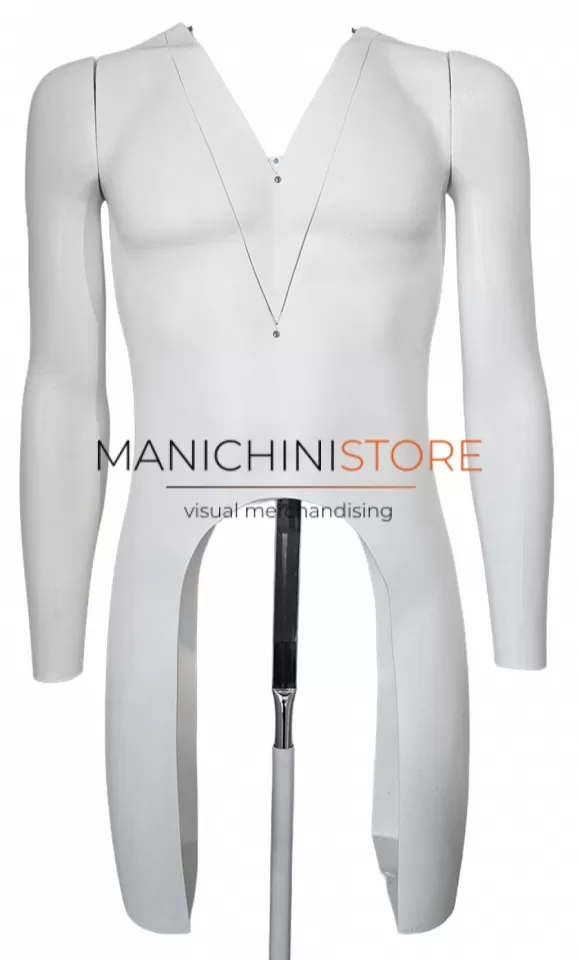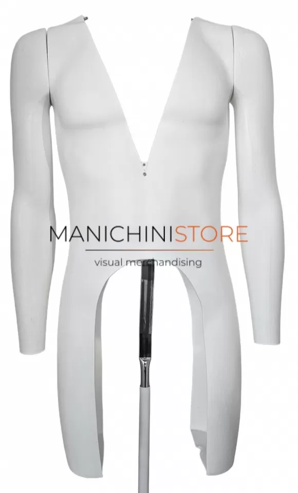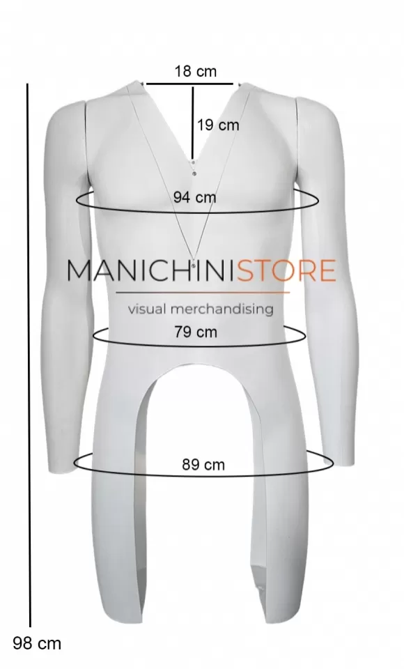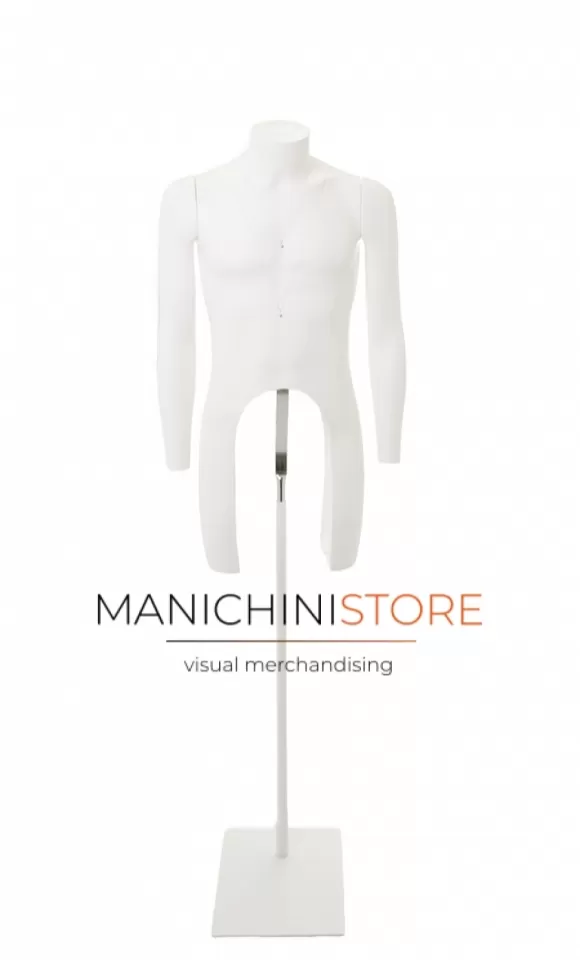 Particolarmente leggero e resistente agli urti il manichino uomo è riciclabile al 100% e dodato di base rettangolare bianca 34x24 con asta regolabile in altezza da 90 a120 cm con attacco sulla schiena.