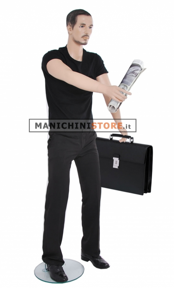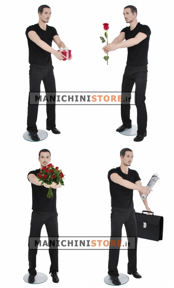 Il manichino si presenta in posizione eretta con gambe lievemente distanziate. Entrambe le braccia stese frontalmente e le mani ricurve in modo da potervi permettere l'ottimale esposizione di accessori.