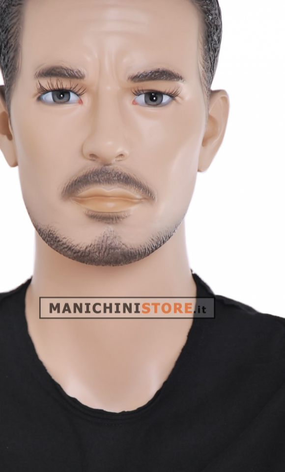 Manichino uomo creato in vetroresina con capelli, baffi e barba scolpiti di colore castano scuro, occhi marroni dallo sguardo intenso e deciso, corporatura snella e ben definita.