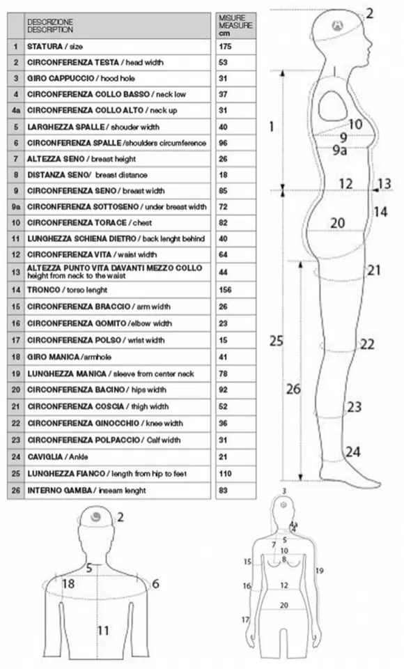 | Taglia | Altezza | Seno/Torace | Vita | Fianchi | Spalla | Scarpe | Collo | Testa |