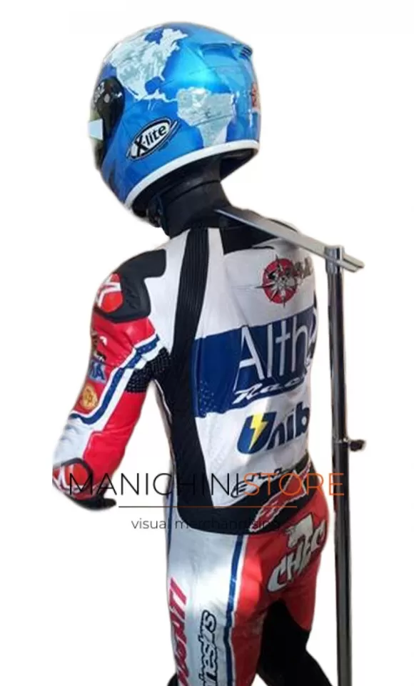 Particolarmente indicato per esporre tute da moto, Il manichino con testa a uovo è predisposto di attacco al collo e di base rettangolare in metallo verniciato nero con asta cromata, ma l'asta del collo può essere facilmente rimossa per utilizzare il manichino da seduto.