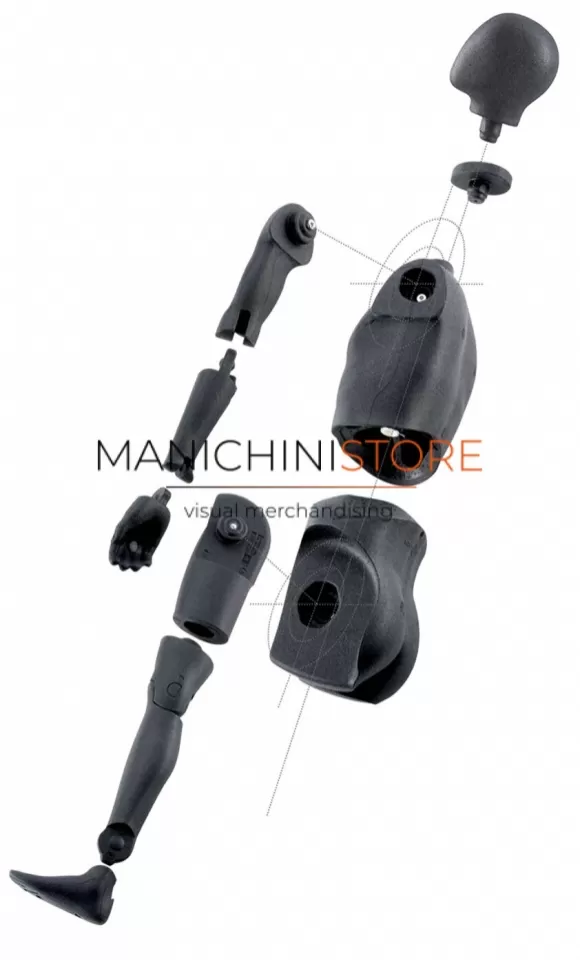 L'alta qualità di fabbricazione con materiale leggero e riciclabile rende il manichino maneggevole e indicato a tutte le esigenze del vostro negozio grazie alle articolazioni snodabili con aggancio magnetico.