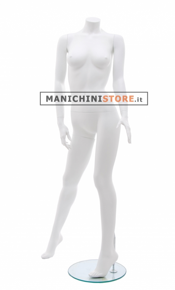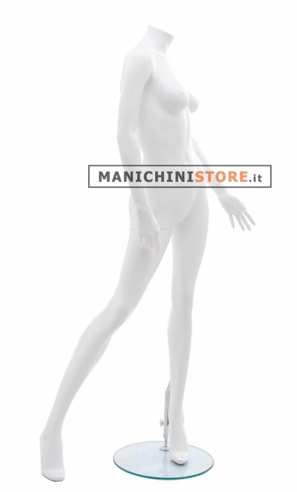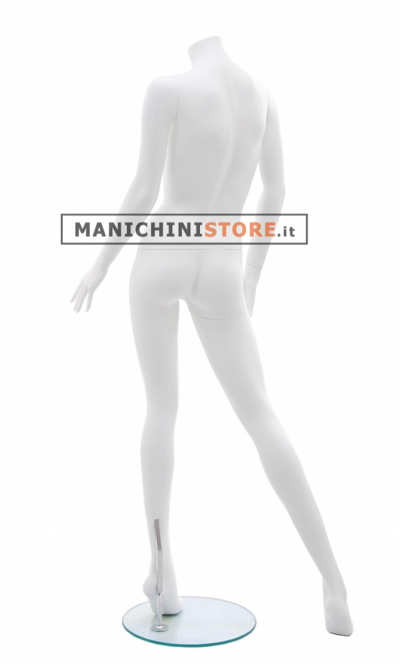 Dotato di attacchi con aggancio rapido, il manichino da donna senza testa verniciato bianco opaco viene fabbricato interamente in vetroresina ed è disponibile in pronta consegna.
