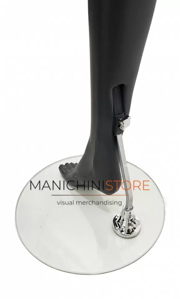 Il manichino è fornito di una base tonda in vetro temperato del diametro di 34 cm con attacco al polpaccio che consente di indossare le calzature.