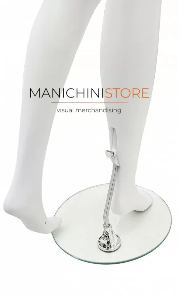 Il manichino è fornito di una base tonda in vetro temperato del diametro di 34 cm con attacco al polpaccio che consente di indossare le calzature e di terminale collo dello stesso materiale.