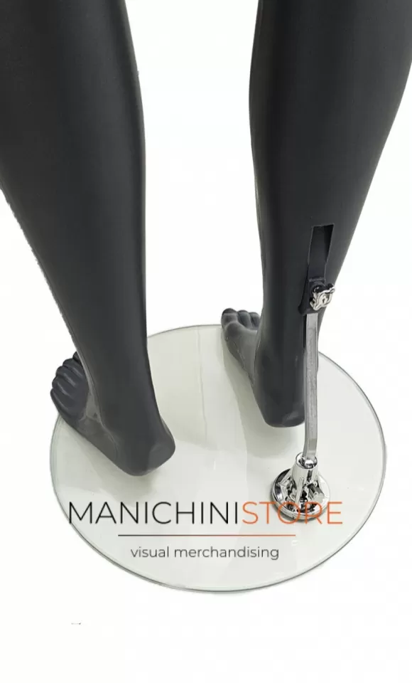 Il manichino è fornito di una base tonda in vetro temperato del diametro di 38 cm con attacco al polpaccio che consente di indossare le calzature e di un terminale collo dello stesso materiale.