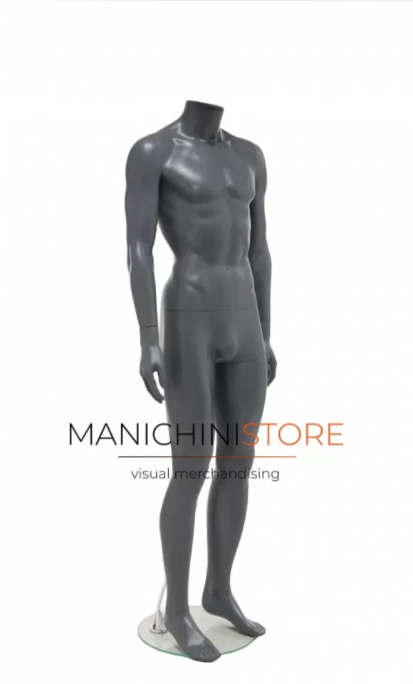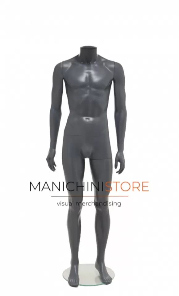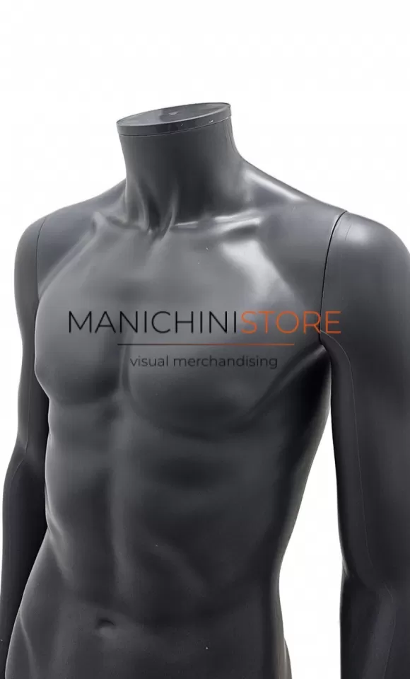Bellissimo manichino uomo realizzato interamente in plastica color grigio antracite, riciclabile al 100%.