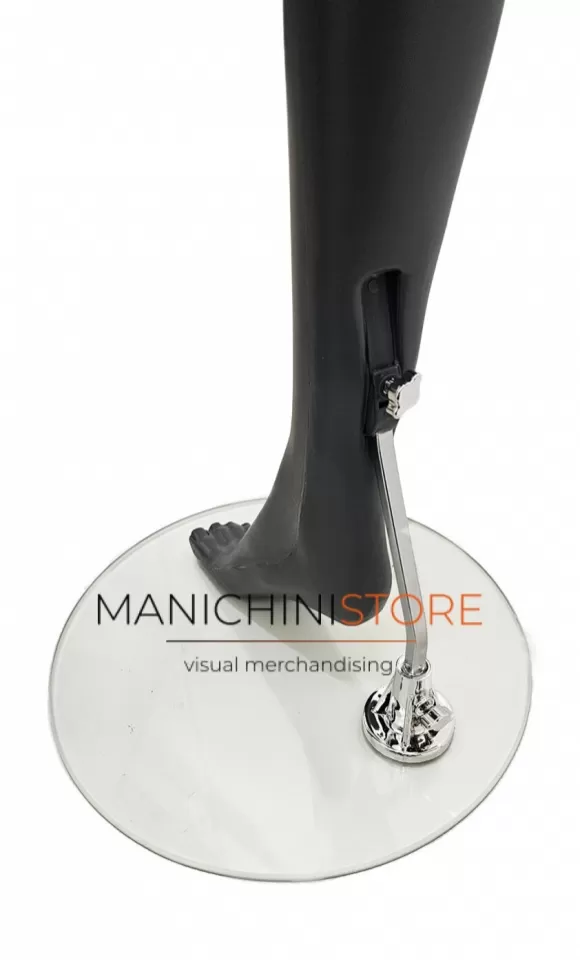Il manichino è fornito di una base tonda in vetro temperato del diametro di 34 cm con attacco al polpaccio che consente di indossare le calzature e di terminale collo dello stesso materiale.