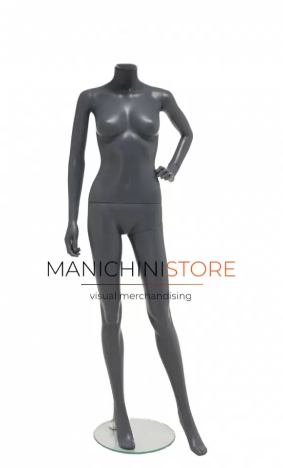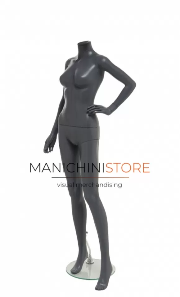 Bellissimo manichino donna realizzato interamente in plastica color grigio antracite, riciclabile al 100%.