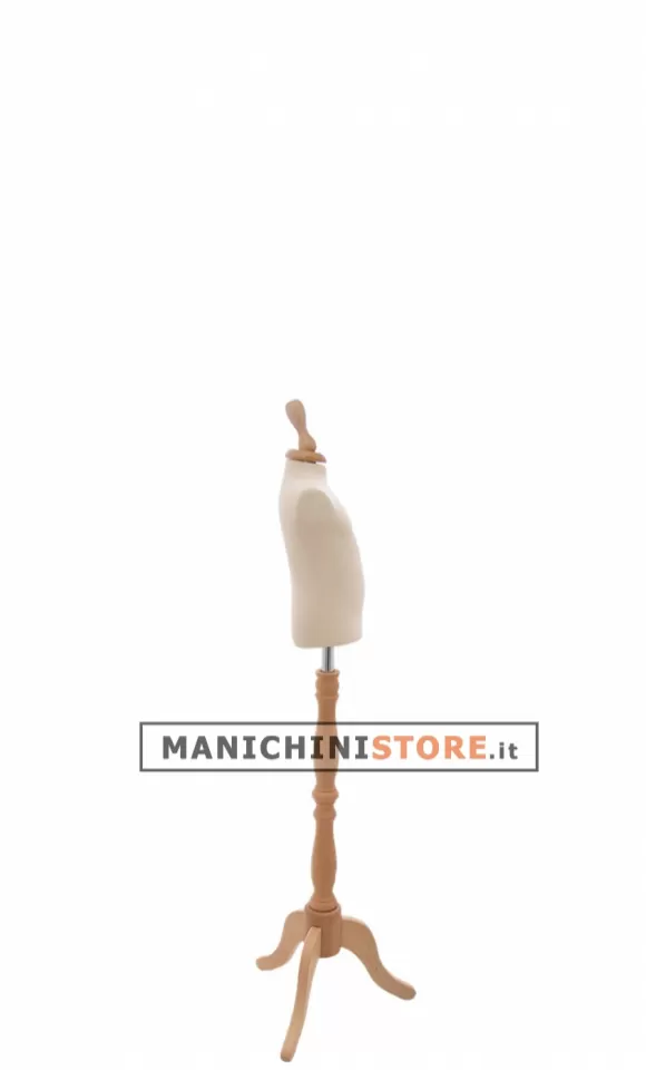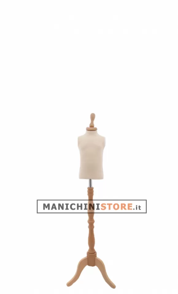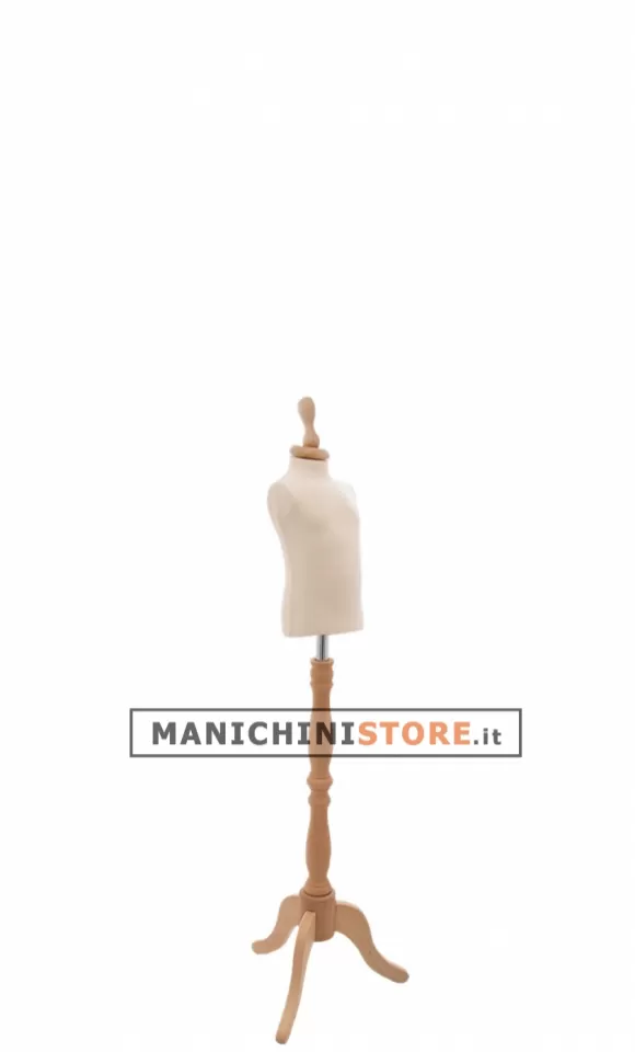 Grazie alla raffinata base treppiede in legno di frassino dalla lavorazione barocca con piantana regolabile in altezza e il terminale a champagne in abbinato, il busto bambino saprà arricchire le vostre vetrine e i vostri negozi risaltando la qualità dei vostri capi di abbigliamento.