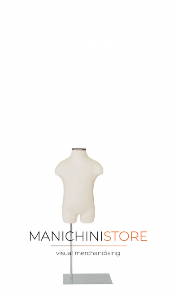Il busto da bambino è unisex e si adatta a diverse tipologie di negozi, è dotato di una base rettangolare 20x30 cm in acciaio, con asta da 70 cm e tubo tondo da 20 mm e di un terminale collo coordinato in acciaio.