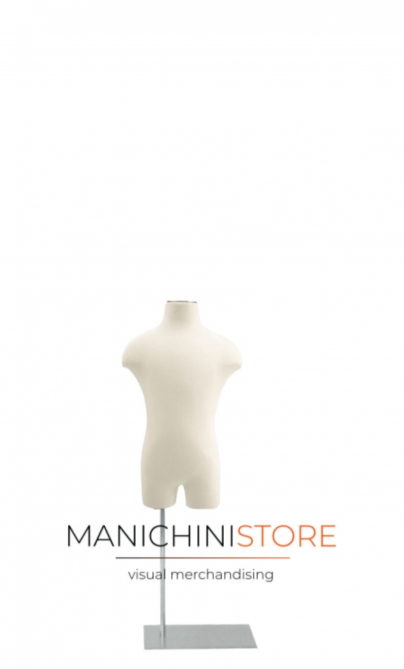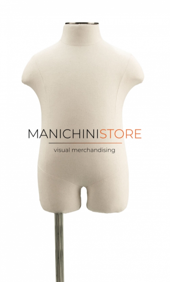 Bellissimo busto bambino 2 anni in poliuretano rivestito in tessuto, con gambe che permettono di indossare i pantaloni e spalle per una migliore vestibilità dei capi.