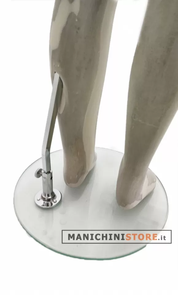 Il manichino è completo di base rotonda in vetro temprato del diametro di 30 cm con attacco al polpaccio che permette di indossare le calzature.