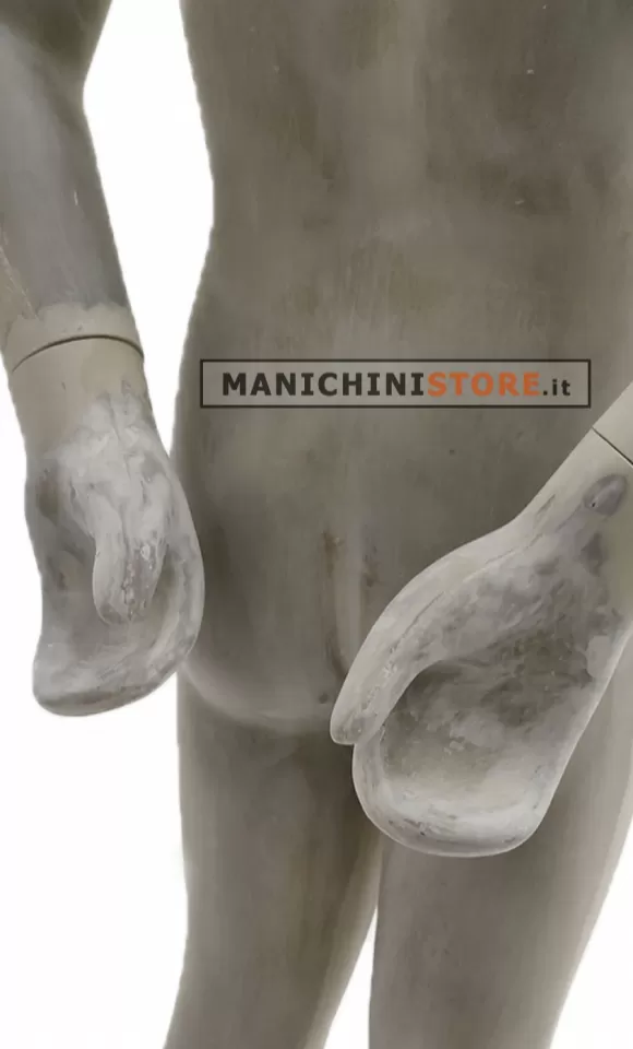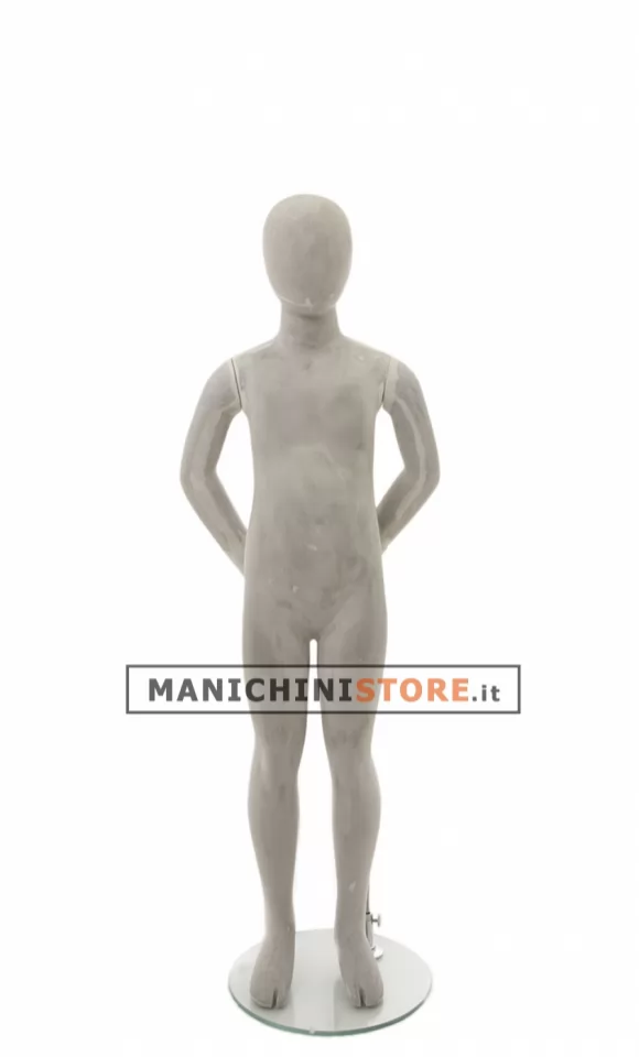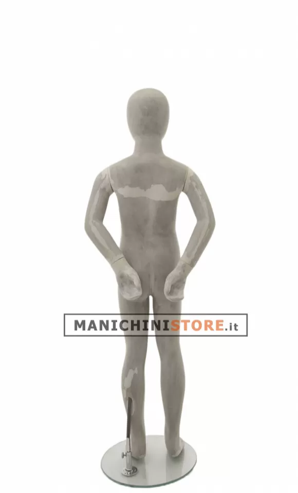 Fantastico manichino bambino dalla testa a uovo di età 5-6 anni realizzato in vetroresina naturale effetto cemento.