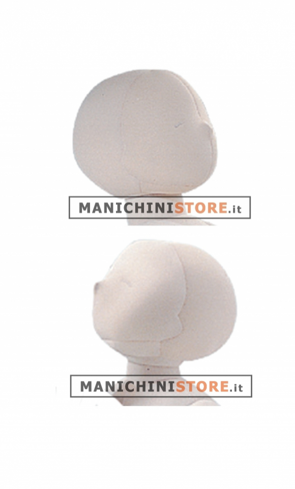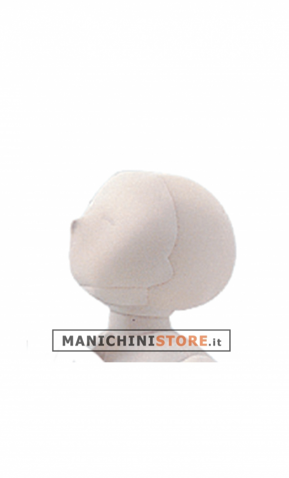 Simpatica testa in tessuto Avorio da abbinare a manichini bambini supersnodati. Di produzione Made in Italy, la testa ha una imbottitura in lana ignifuga rivestita in tessuto Avorio.