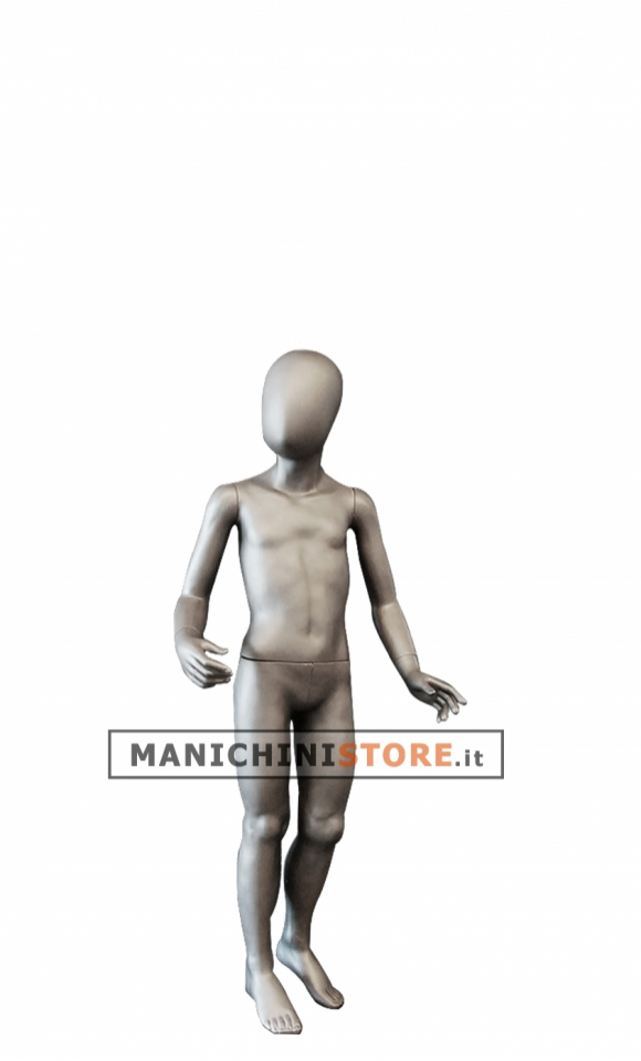 Raffinato manichino bambino di età 5 annidi fabbricazione Made in Italy costruito in soffiaggio plastico verniciato color Nichel.