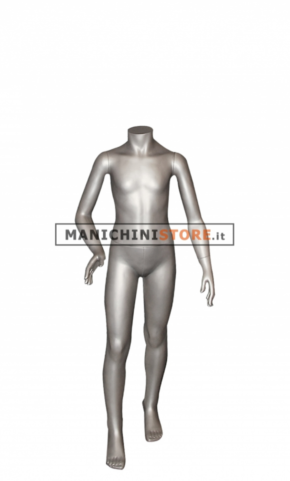 Favoloso manichino bambino di età 8 anni di fabbricazione Made in Italy costruito in soffiaggio plastico verniciato color Nichel.