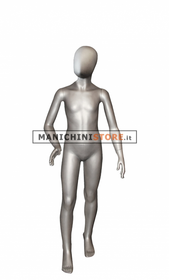 Manichino bambino di età 8 anni dalla testa a uovo di fabbricazione Made in Italy costruito in soffiaggio plastico verniciato color Nichel.
