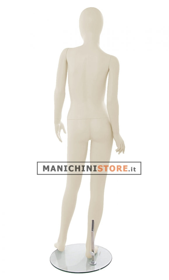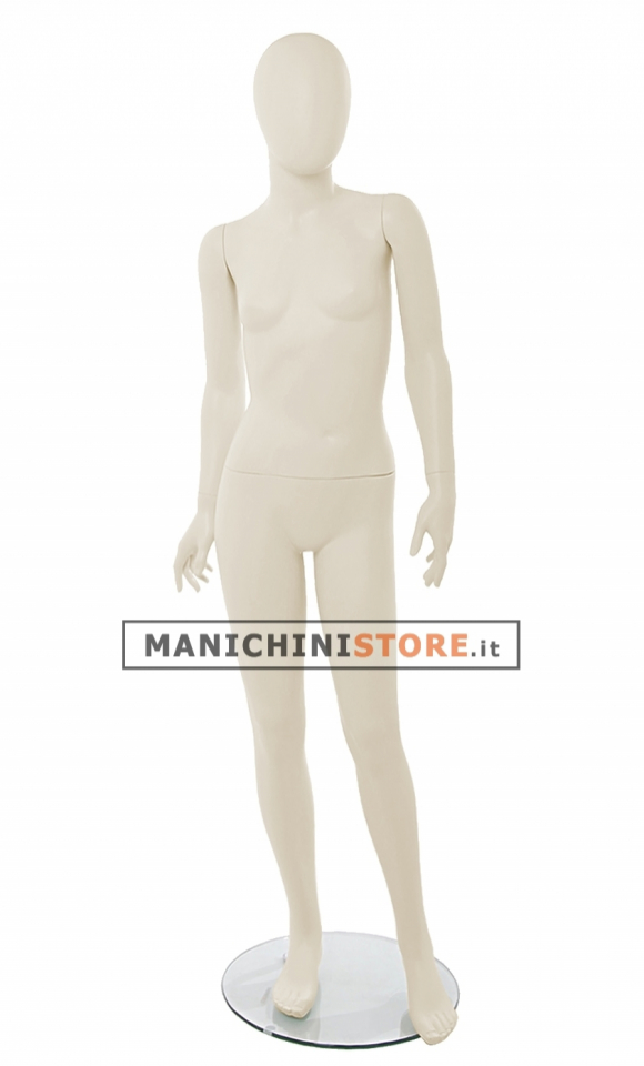 Fantastico manichino bambina dalla testa a uovo di età 12-13 anni realizzato in vetroresina verniciato avorio.