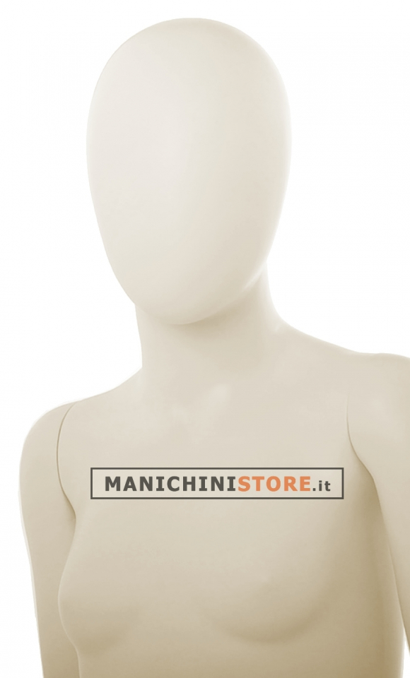 Il manichino si presenta in posizione eretta con entrambe le braccia dritte lungo i fianchi. La testa a uovo e la postura, rendono l'immagine complessiva dinamica ed accattivante.
