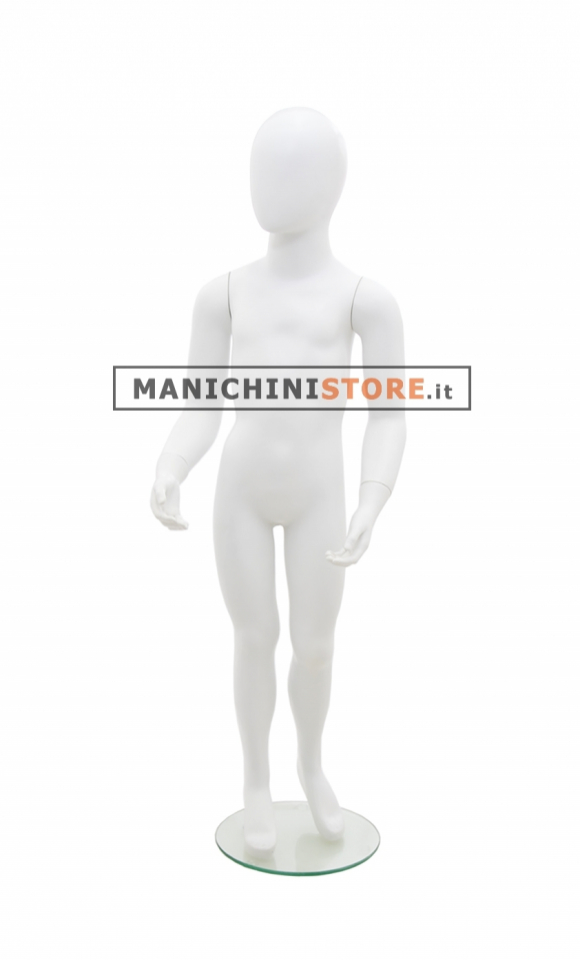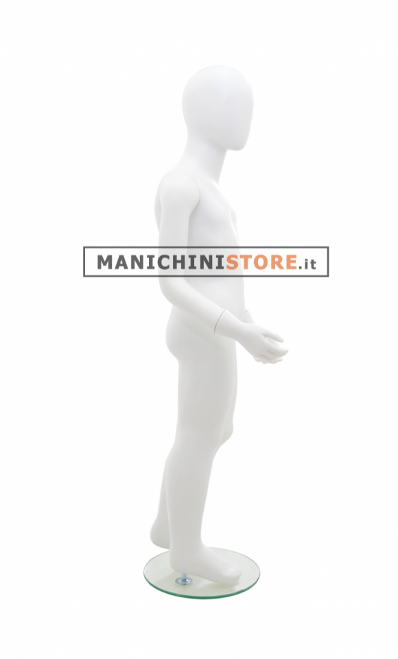 Fantastico manichino bambino dalla testa a uovo di età 4-5 anni realizzato in vetroresina verniciato bianco opaco.
