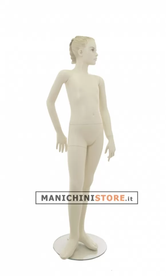 Manichino bambina realizzato in vetroresina con capelli scolpiti e provvisto di trucco leggero che rende lo sguardo dolce e delicato.